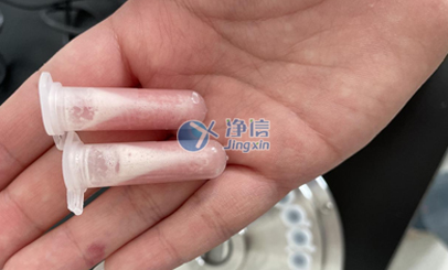 實驗開始客戶使用自配的離心管進行研磨,兩個樣品,另外添加兩個凈信生產的加厚研磨管進行四角配平,時間30s,功率調到4檔??蛻舻碾x心管很薄,立馬被擊碎,凈信加厚研磨管沒有破裂但也出現(xiàn)了較嚴重磨損。