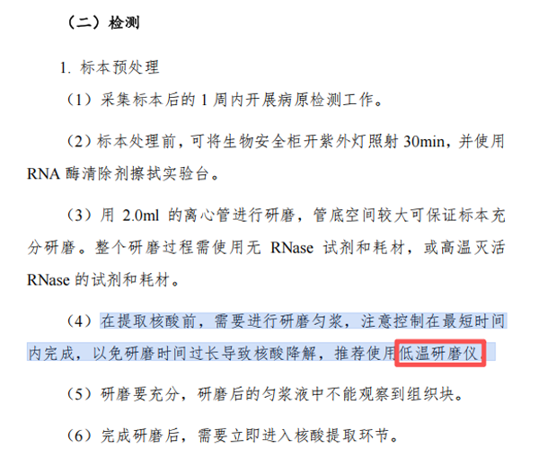 在病媒生物樣本保存與處理中,涉及RNA等易降解物質(zhì),冷凍研磨儀優(yōu)勢凸顯。當(dāng)組織需置于RNA later保存液或超低溫環(huán)境,冷凍研磨儀可在低溫條件下研磨,避免RNA因研磨產(chǎn)熱降解,保障病原核酸檢測的準(zhǔn)確性。無論是病媒生物病原學(xué)監(jiān)測的常規(guī)樣本,還是特殊保存條件的樣本,冷凍研磨儀都能穩(wěn)定輸出高質(zhì)量研磨效果,適配《技術(shù)指南》中多樣本類型處理需求。