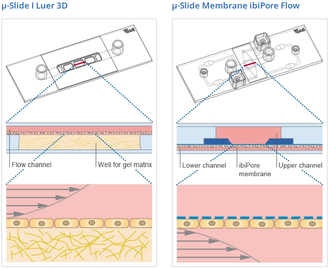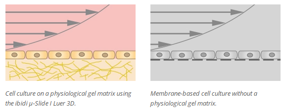 The μ-Slide I Luer 3D allows for creating an endothelial barrier without the need of an artificial filter membrane. Endothelial cells can be seeded on a suitable gel matrix, such as Collagen Type I, Rat Tail. After connecting the slide to a pump and applying defined shear stress, an in vivo-like endothelial barrier assay is created. This model simulates blood vessels on a soft ECM matrix instead of using a hard filter membrane.